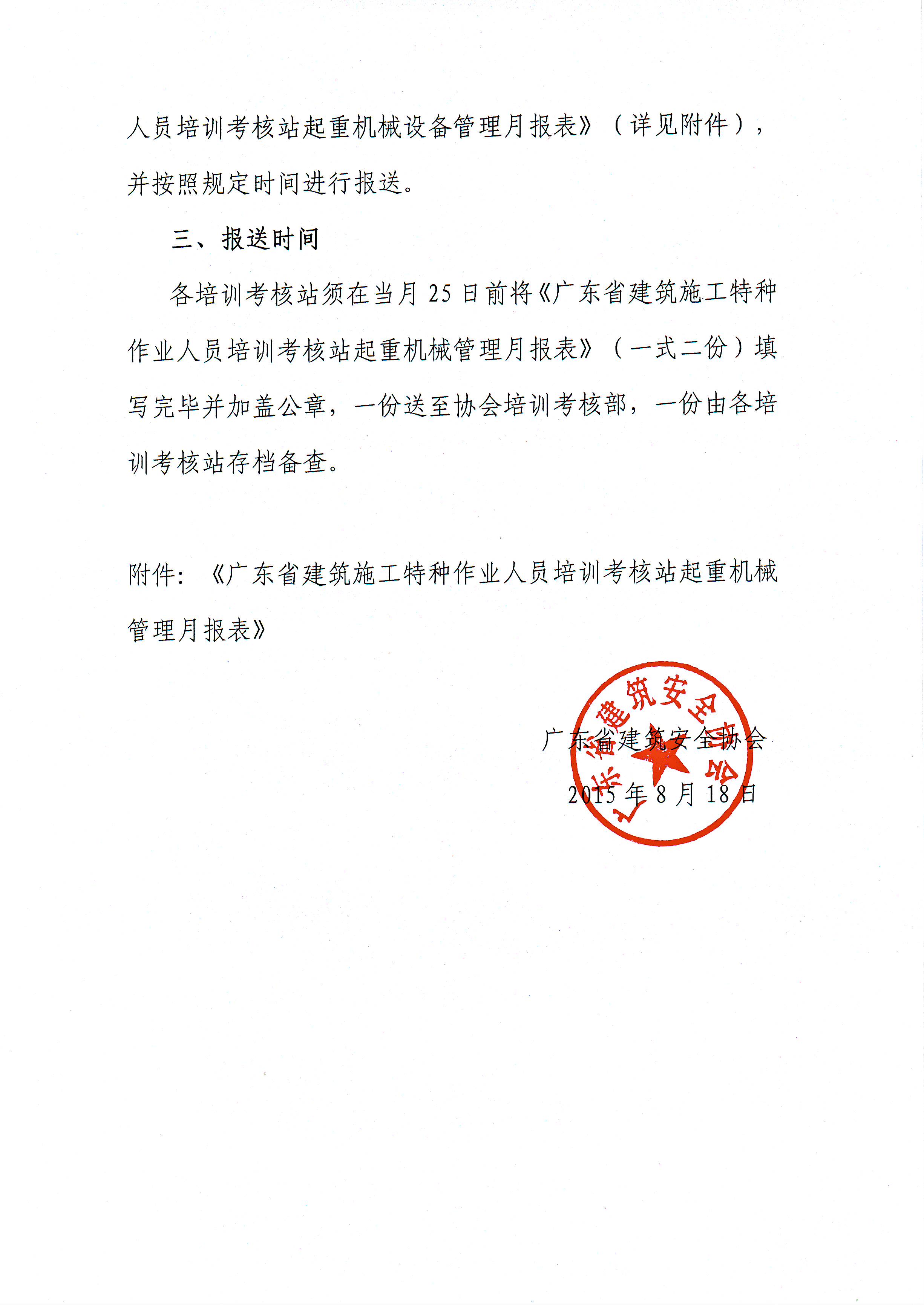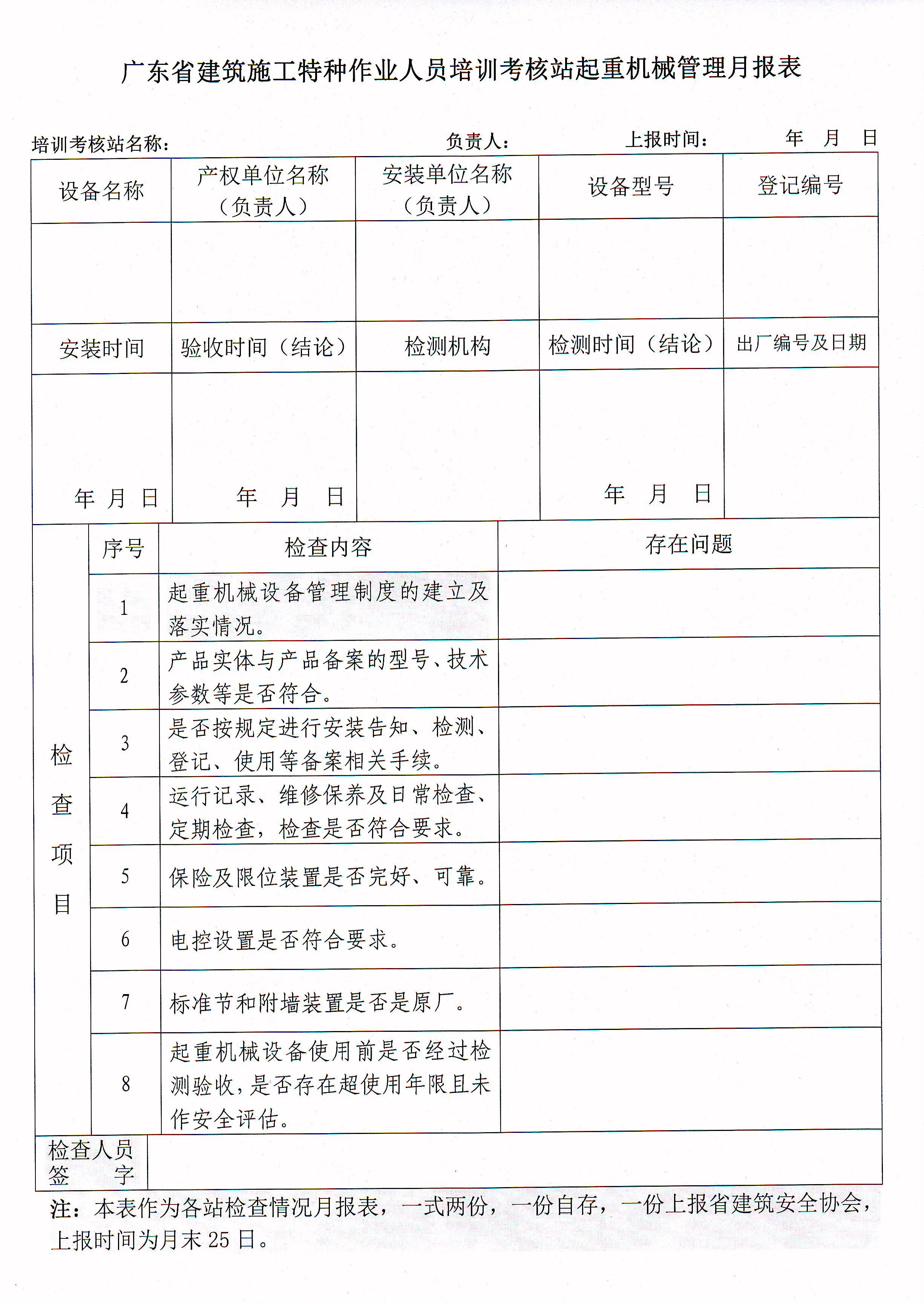 各培训考核站须在当月25日前将《广东省建筑施工特种作业人员培训考核站起重机械管理月报表》(一式二份)填写完毕并加盖公章,一份送至协会培训考核部,一份由各培训考核站存档备查。