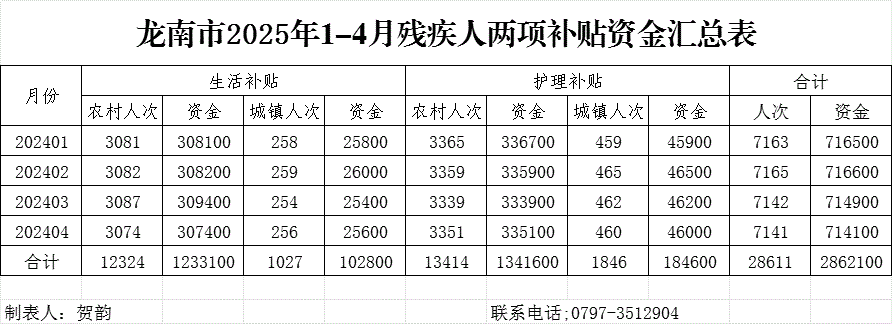 龙南市2025年1-4月残疾人两项补贴资金汇总表