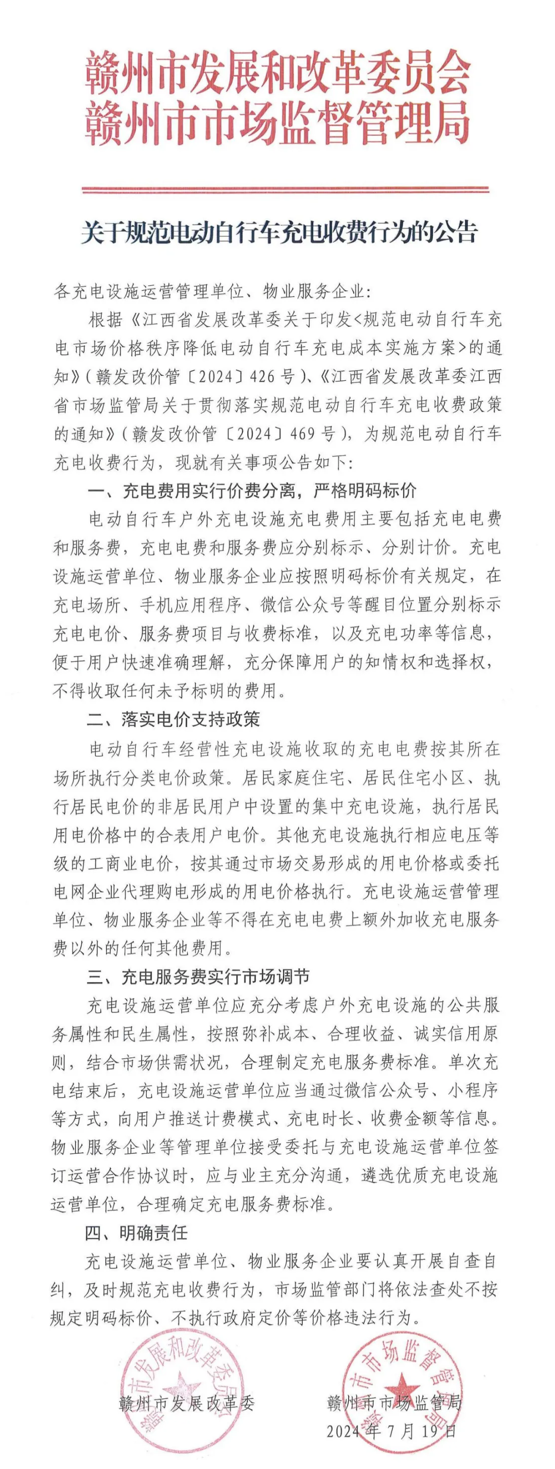 为加强电动自行车充电收费行为,近日,赣州市发展和改革委员会、赣州市市场监督管理局联合印发《关于规范电动自行车充电收费行为的公告》(以下简称《公告》)。