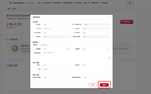 路径:点击立即申请,提交企业及融资相关信息(带*为必填项),点击发布,完成贷款申请。