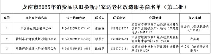 为贯彻落实《江西省民政厅 江西省商务厅 江西省财政厅关于印发<江西省2025年消费品以旧换新居家适老化改造实施细则>的通知》《赣州市民政局 赣州市商务局 赣州市财政局关于转发《江西省民政厅 江西省商务厅 江西省财政厅关于印发<江西省2025年消费品以旧换新居家适老化改造实施细则>的通知》文件精神,有序推进我市2025年消费品以旧换新居家适老化改造工作,改善老年人的居家生活环境,缓解老年人因身体机能退化导致的生活不适应,有效提升老年人的获得感、幸福感、安全感。现将经申报、审核、遴选后的龙南市2025年消费品以旧换新居家适老化改造服务商名单(第二批)进行公示。同时,因江西养老平台限制,取消深圳市迈步机器人科技有限公司作为2025年消费品以旧换新居家适老化改造服务商: