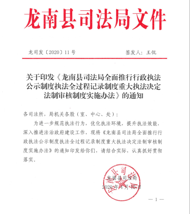关于印发《龙南县司法局全面推行行政执法公示制度执法全过程记录制度重大执法决定法制审核制度实施办法》的通知