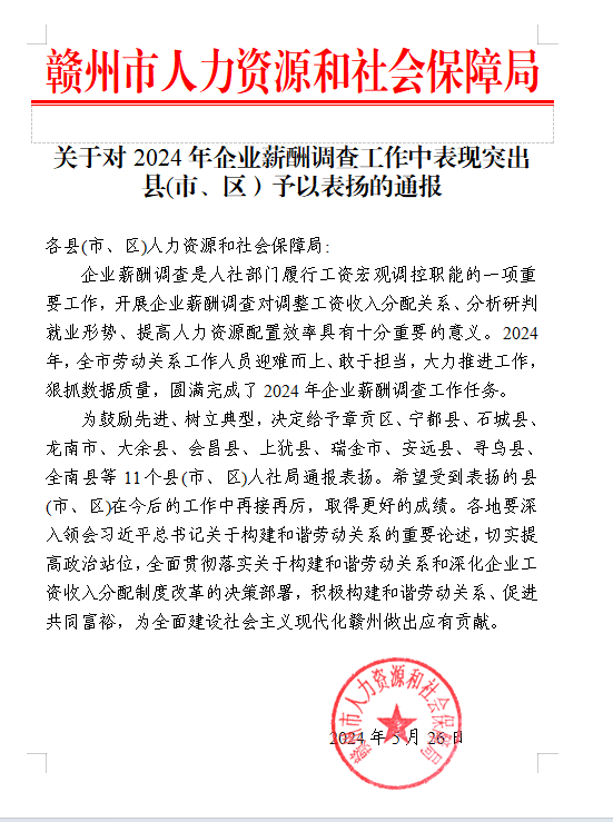 关于对2024年企业薪酬调查工作中表现突出县(市、区)予以表扬的通报