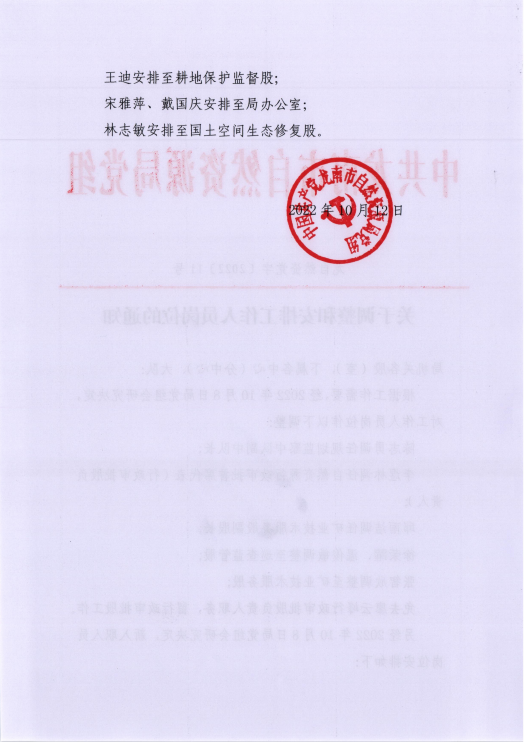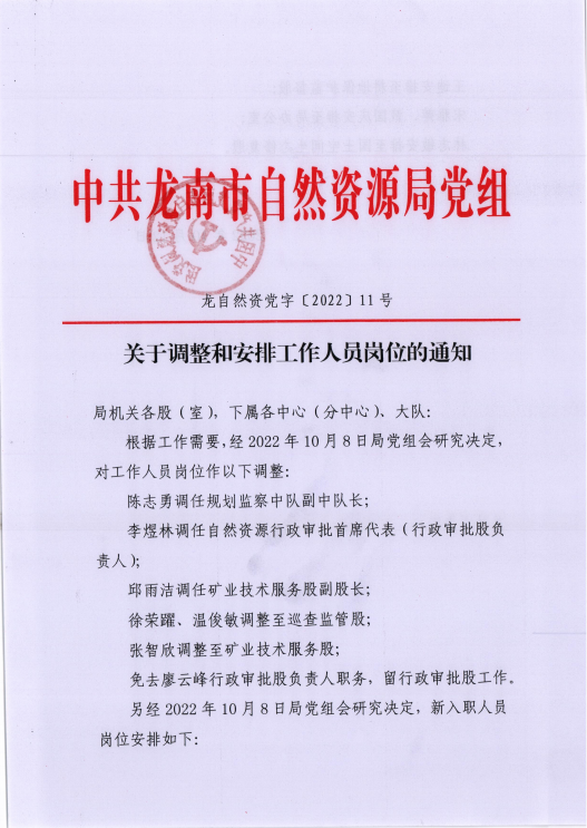 关于调整和安排工作人员岗位的通知(龙自然资党字[2022]11号)