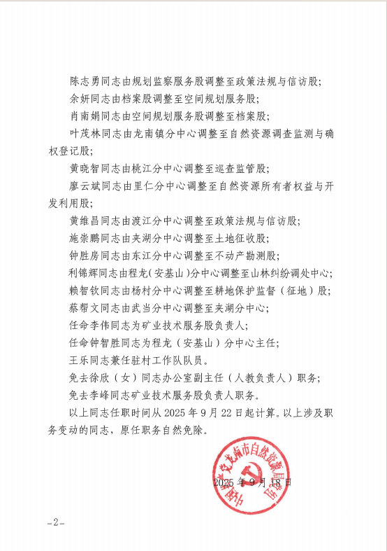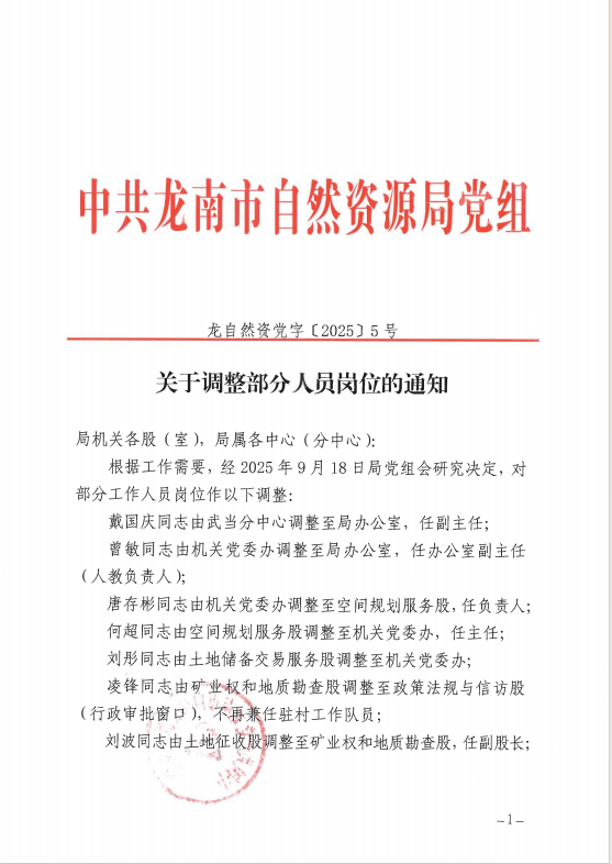 关于调整部分人员岗位的通知(龙自然资党字〔2025〕5号)