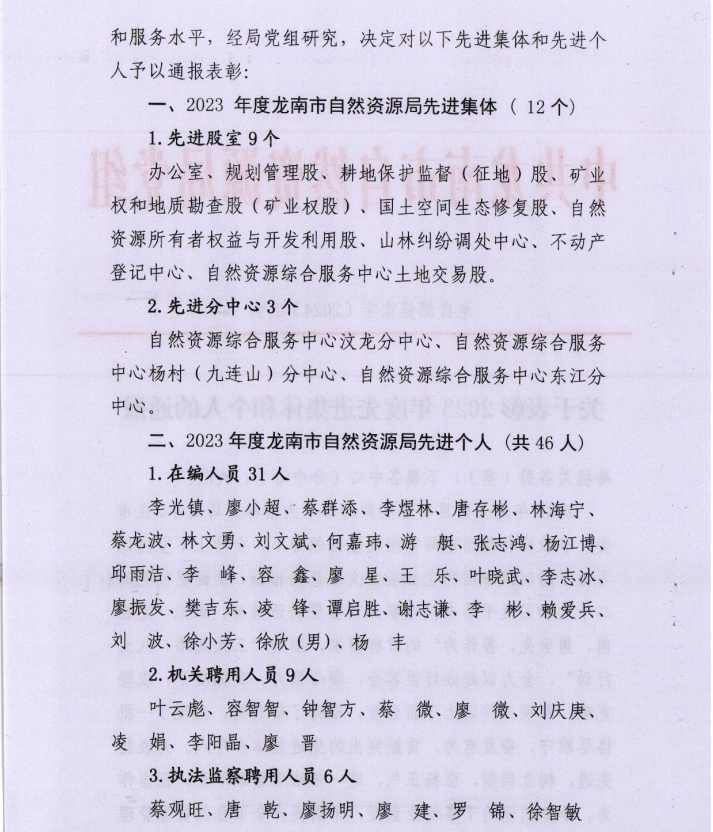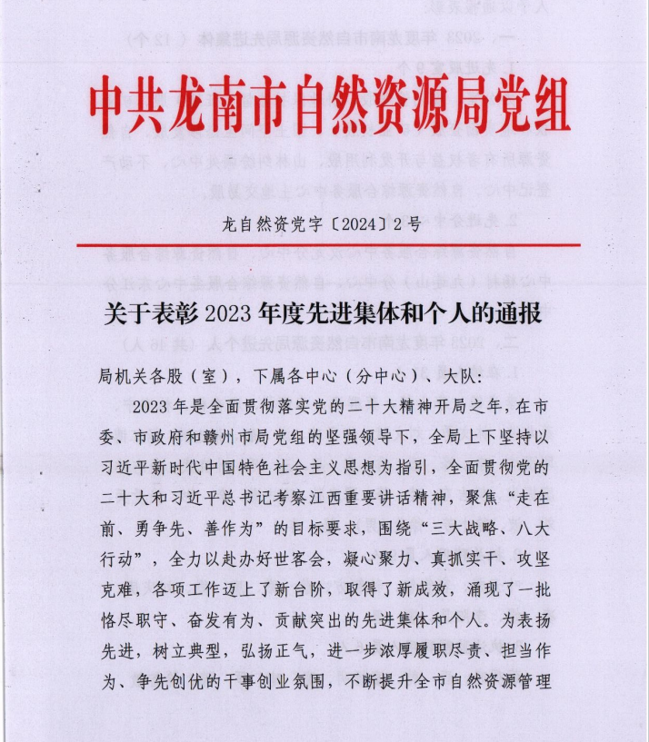 中共龙南市自然资源局党组关于表彰2023年度先进集体和个人的通报