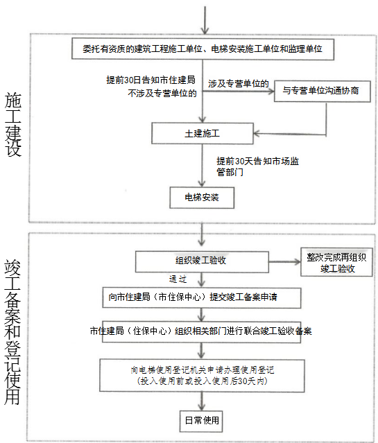 (一)加装电梯开工建设前,建设者应当向市住建局履行开工告知手续。施工过程中,监理单位应组织建设者、(勘察)设计、土建施工等单位对分部工程质量进行验收;电梯安装前,电梯安装施工单位应书面向市场监督管理部门办理安装告知,方可施工。
