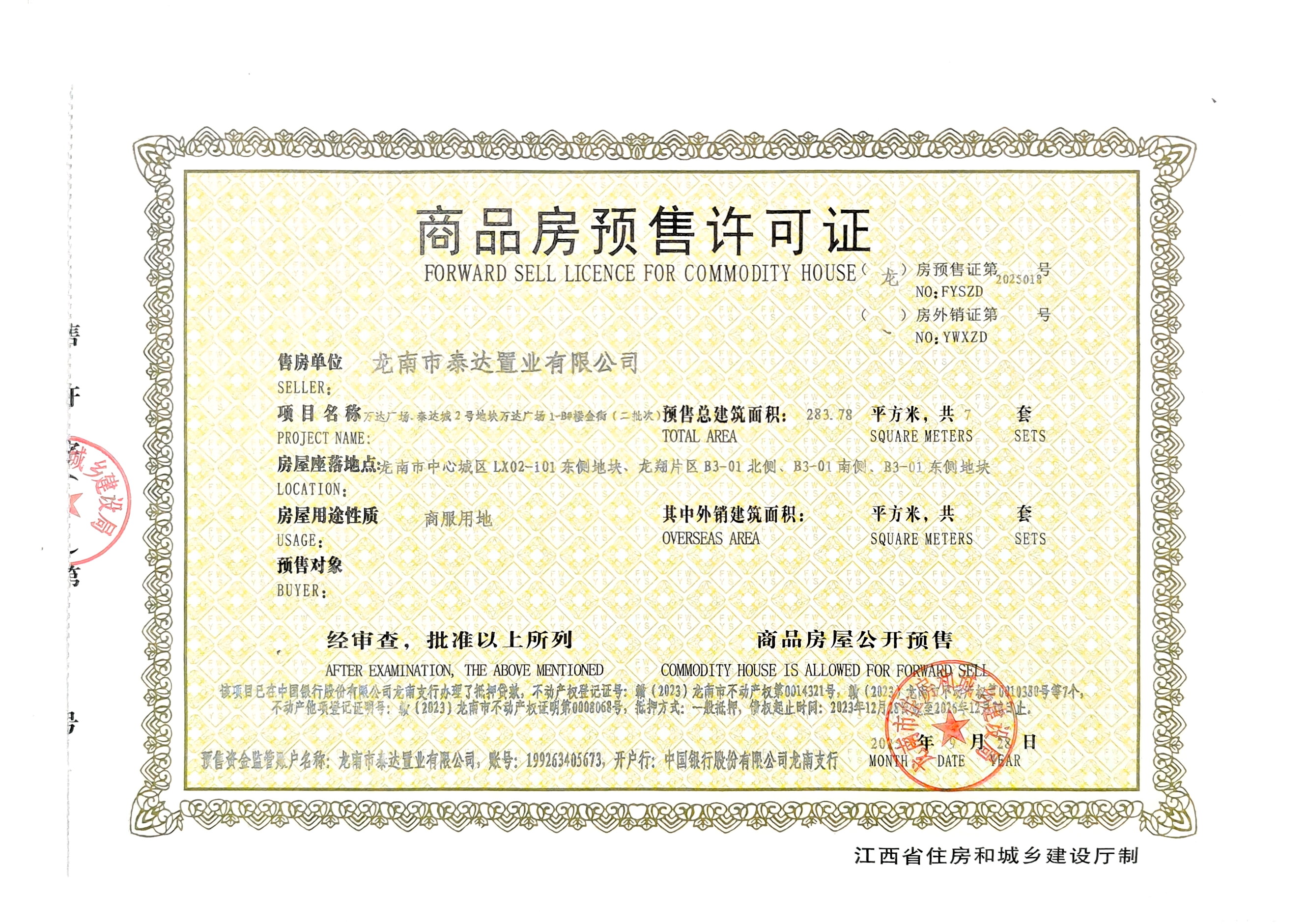 【商品房预售许可证】万达广场·泰达城2号地块万达广场1-B#楼金街(二批次)