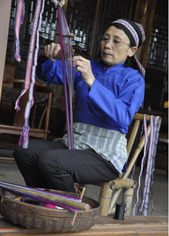 (图为龙南客家织带制作技艺市级传承人廖秋华)