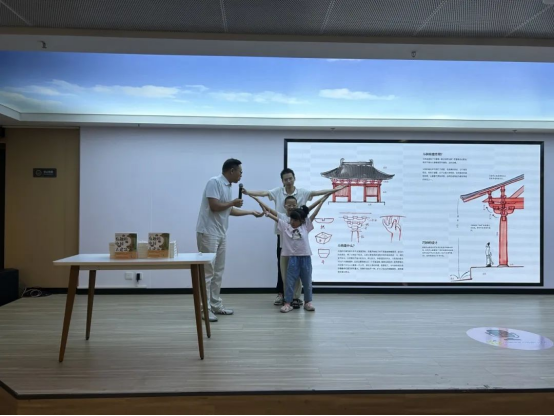 “斗拱是什么?”“常见的屋顶样式有哪些?”“屋脊走兽有什么寓意?”建筑知识抢答环节,小读者们热情高涨,踊跃举手回答问题。杨大炜老师俯身与小读者们亲切对话,在一问一答间,一点点揭开古建筑里藏着的“十万个为什么”。