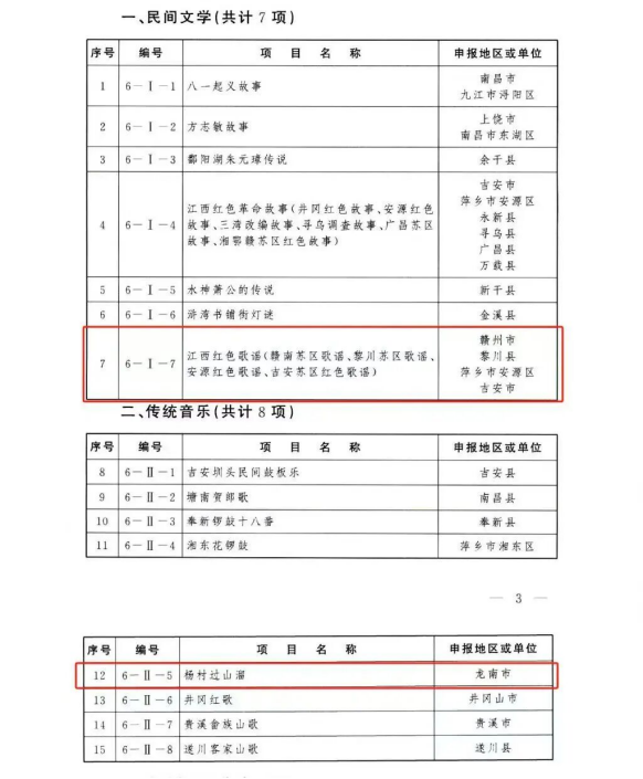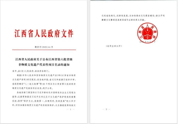 8月1日,江西省人民政府公布了第六批省级非物质文化遗产代表性项目名录,杨村过山溜、江西红色歌谣(赣南苏区歌谣)经过层层评审,成功入选,为我市再添2项省级非遗项目。截至目前,龙南市共有省级非遗项目7项。