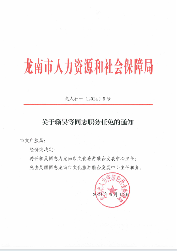 龙人社干[2024]5号关于赖昊等同志职务任免的通知