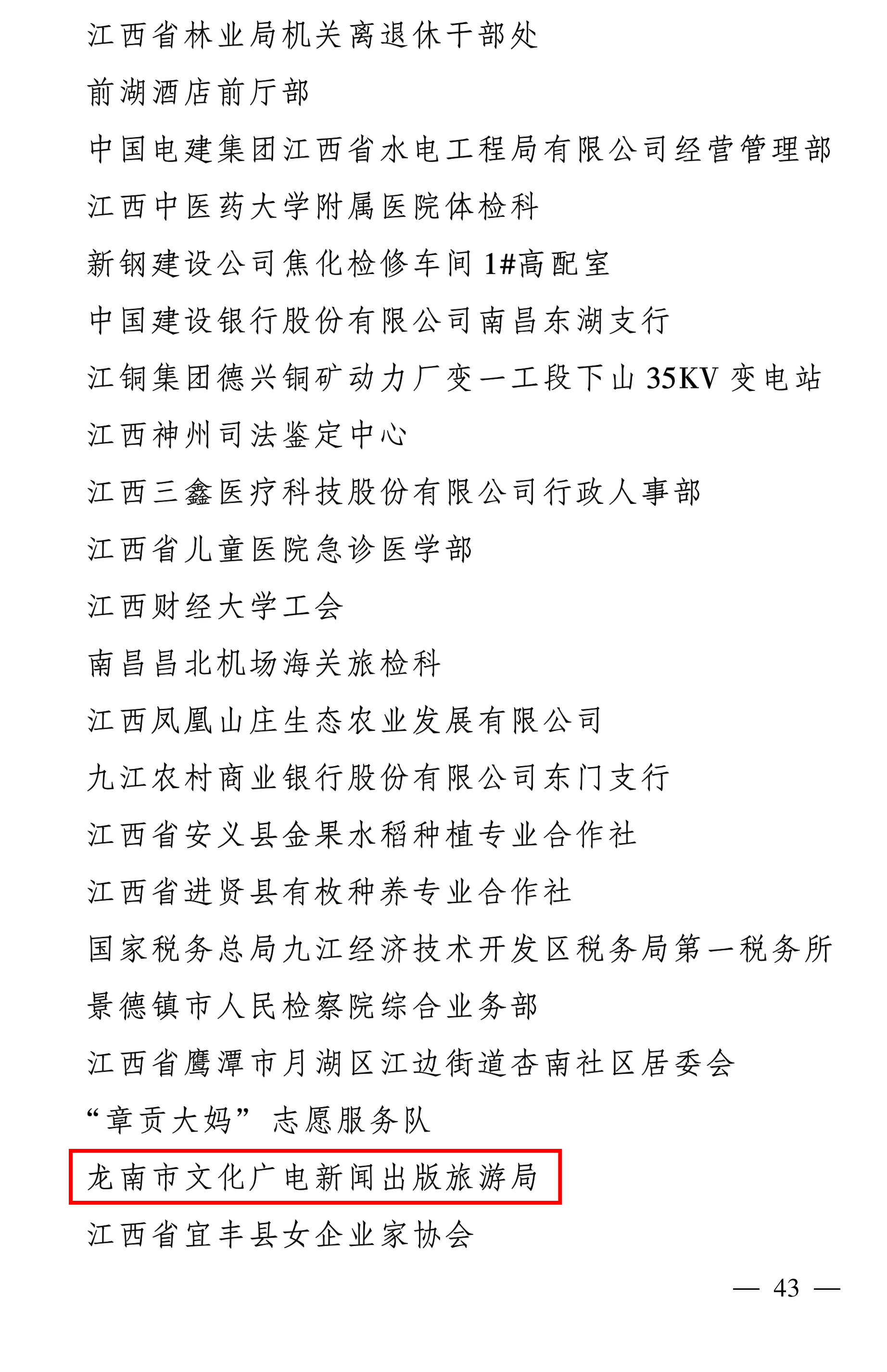 2021年3月1日龙南市文化广电新闻出版旅游局荣获“全国巾帼文明岗”荣誉称号。