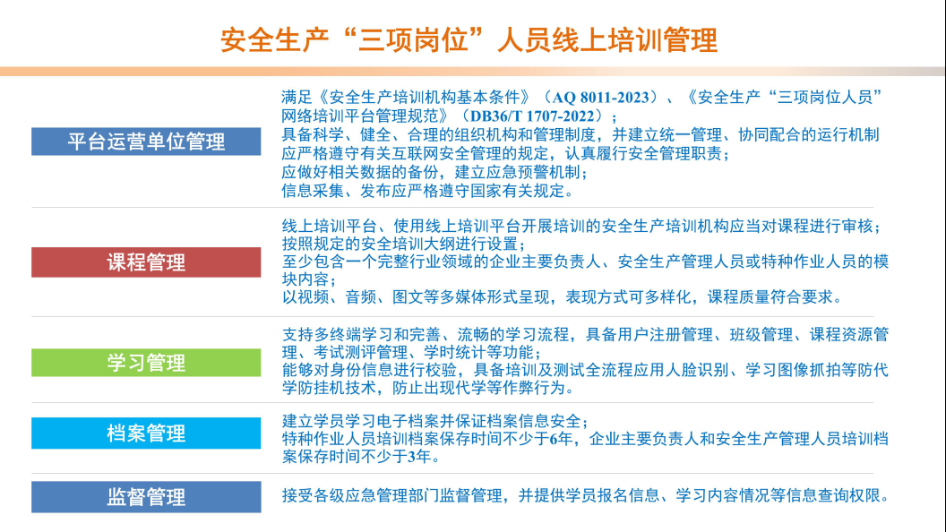 2022年12月13日,我省地方标准《安全生产“三项岗位人员”网络培训平台管理规范》(DB36/T1707-2022)印发,自2023年6月1日起实施。同时,根据《江西省应急管理厅关于公开遴选安全生产“三项岗位人员”网络培训平台的通知》(赣应急字〔2023〕14号)安排,按照自主申报、市局推荐、资料评审、现场评审、网上公示的工作程序,省应急管理厅遴选出线上培训平台服务从业人员线上培训,进一步解决从业人员工学矛盾、提高培训效能。为规范我省安全生产线上培训工作,出台《江西省安全生产“三项岗位”人员线上培训管理办法(试行)》(以下简称《办法》)。