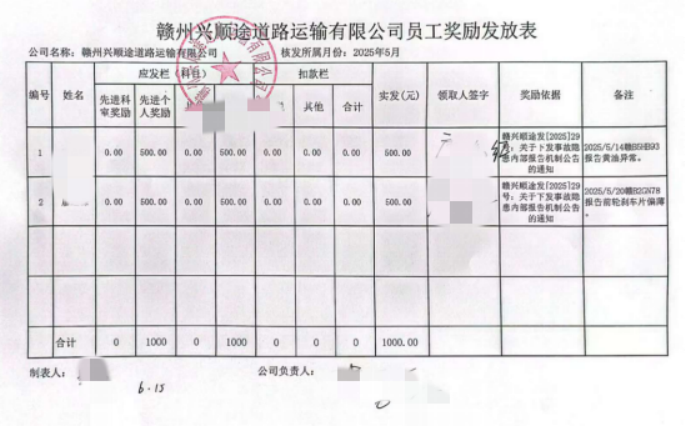 2025年5月20日,赣州兴顺途道路运输有限公司某驾驶员在出车检查中发现赣B2GN78车辆前轮刹车片偏薄,存在安全隐患,遂上报给公司负责人。公司接到报告后立即组织安全管理人员核查,及时整改消除了事故隐患,并按照事故隐患内部报告奖励制度的规定,对驾驶员主动发现隐患行为提出表扬,并给予500元奖励。
