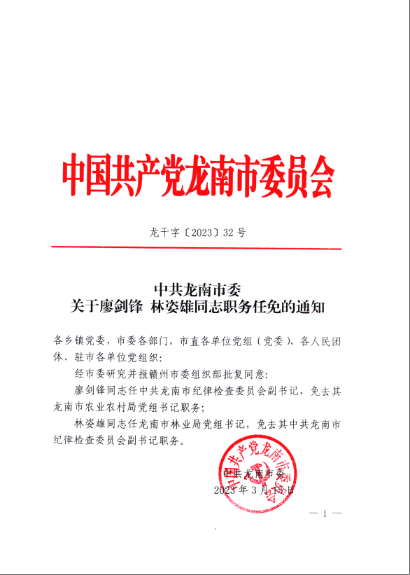 关于廖剑锋 林姿雄同志职务任免的通知