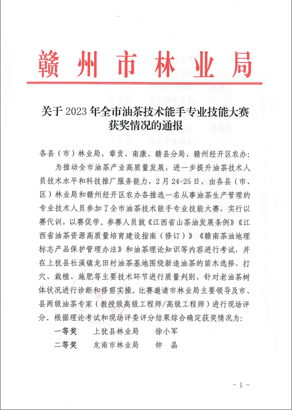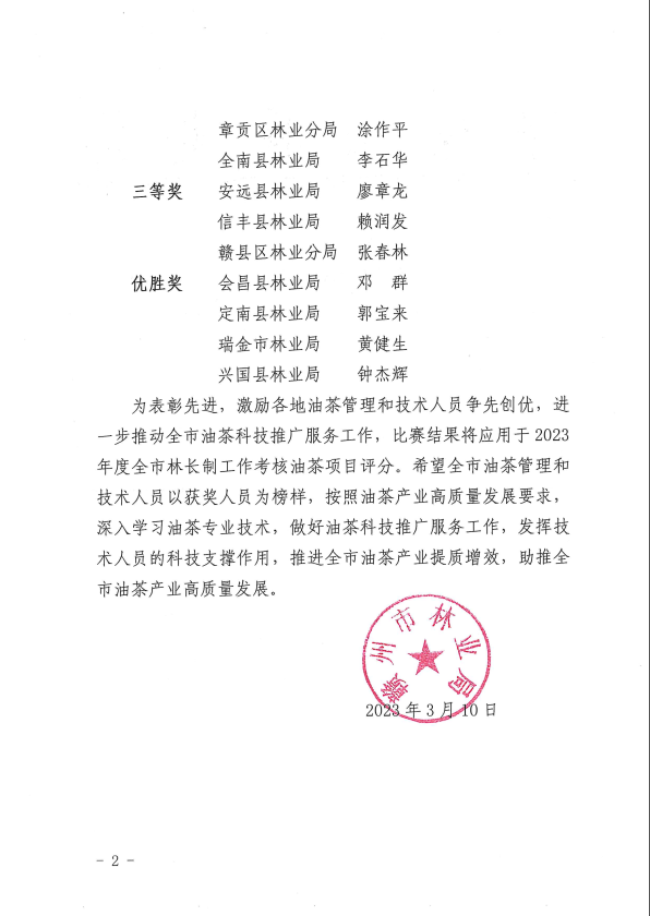 关于2023年全市油茶技术能手专业技能大赛获奖情况的通报