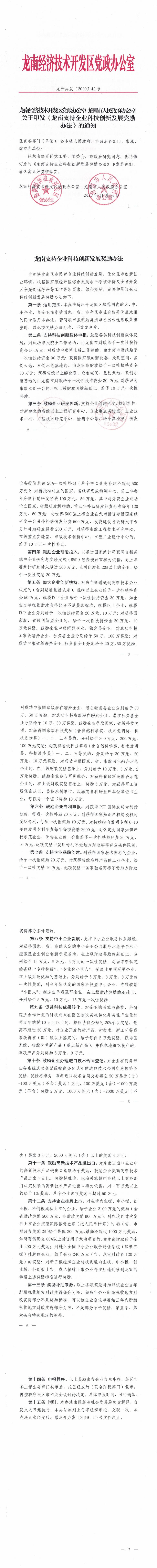 关于印发《龙南支持企业科技创新发展奖励办法》的通知