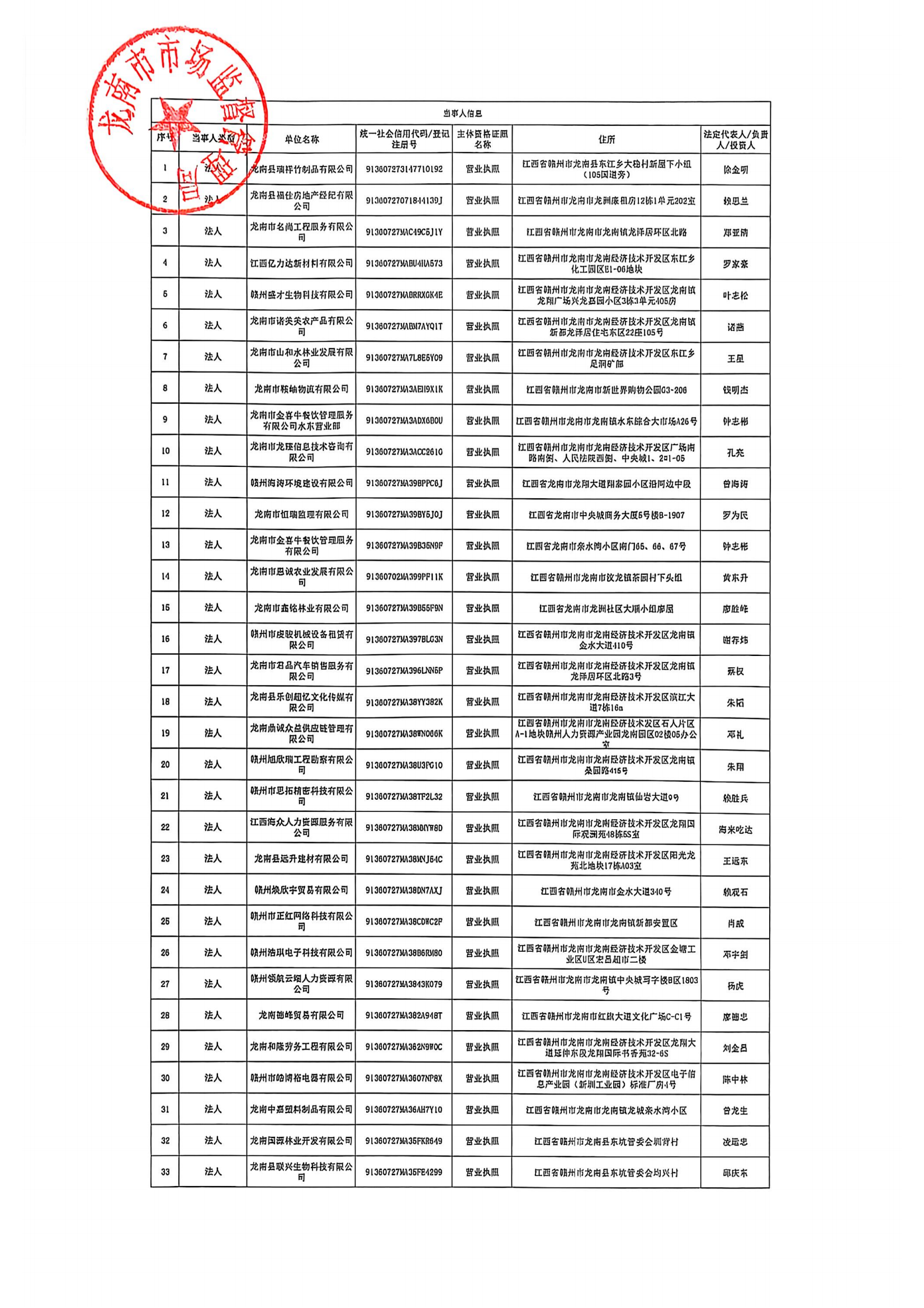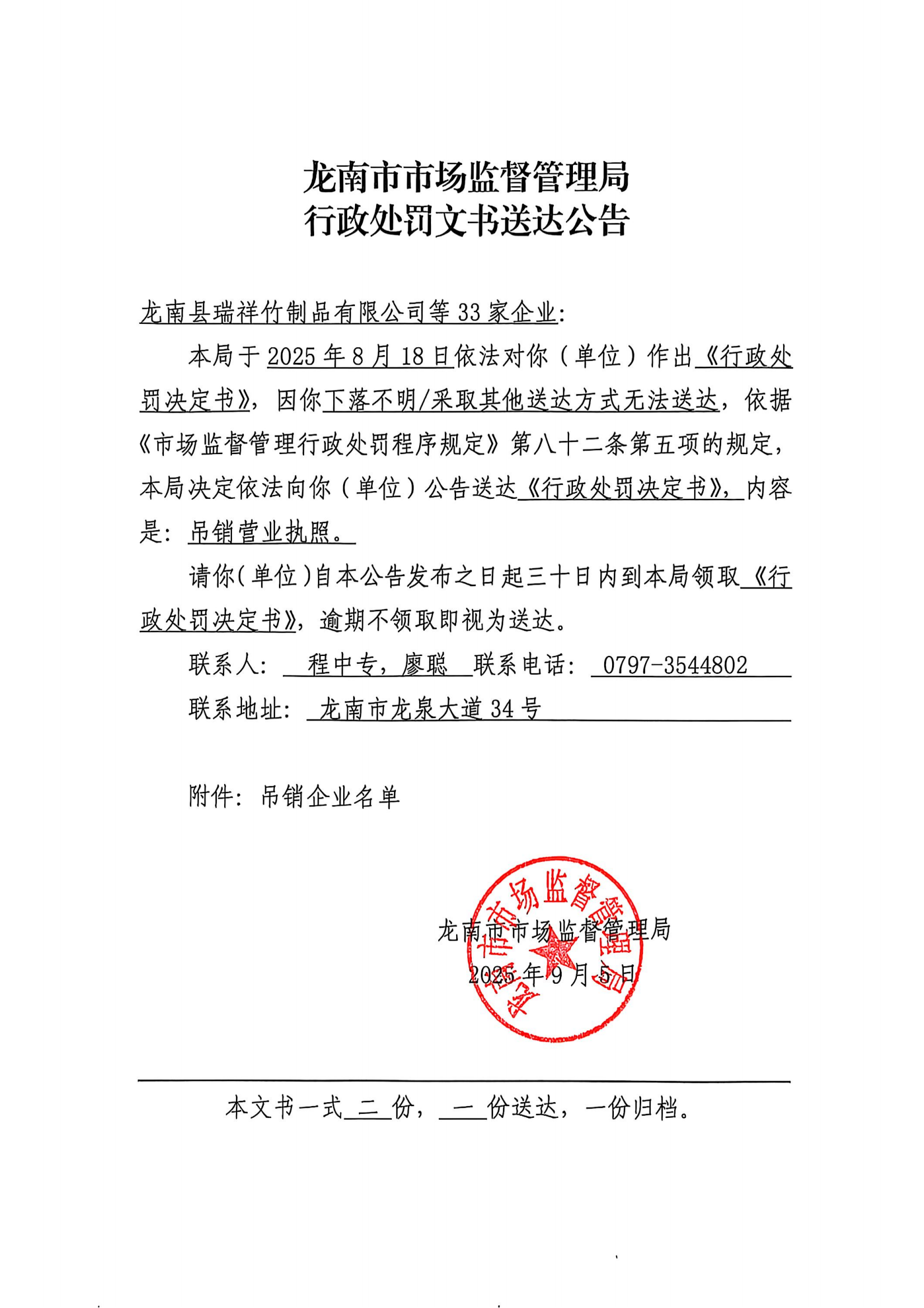 行政处罚文书送达公告(龙南县瑞祥竹制品有限公司等33家企业)