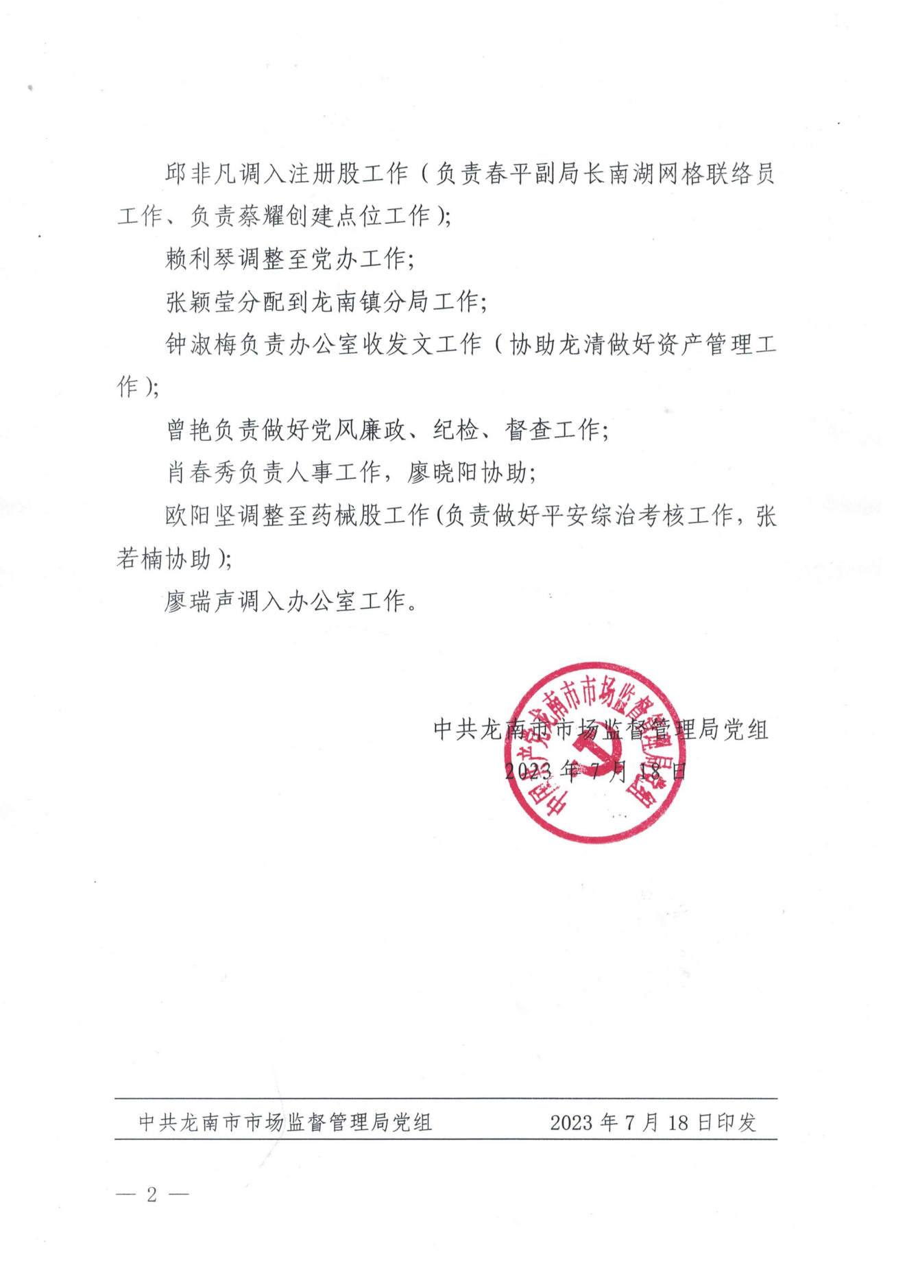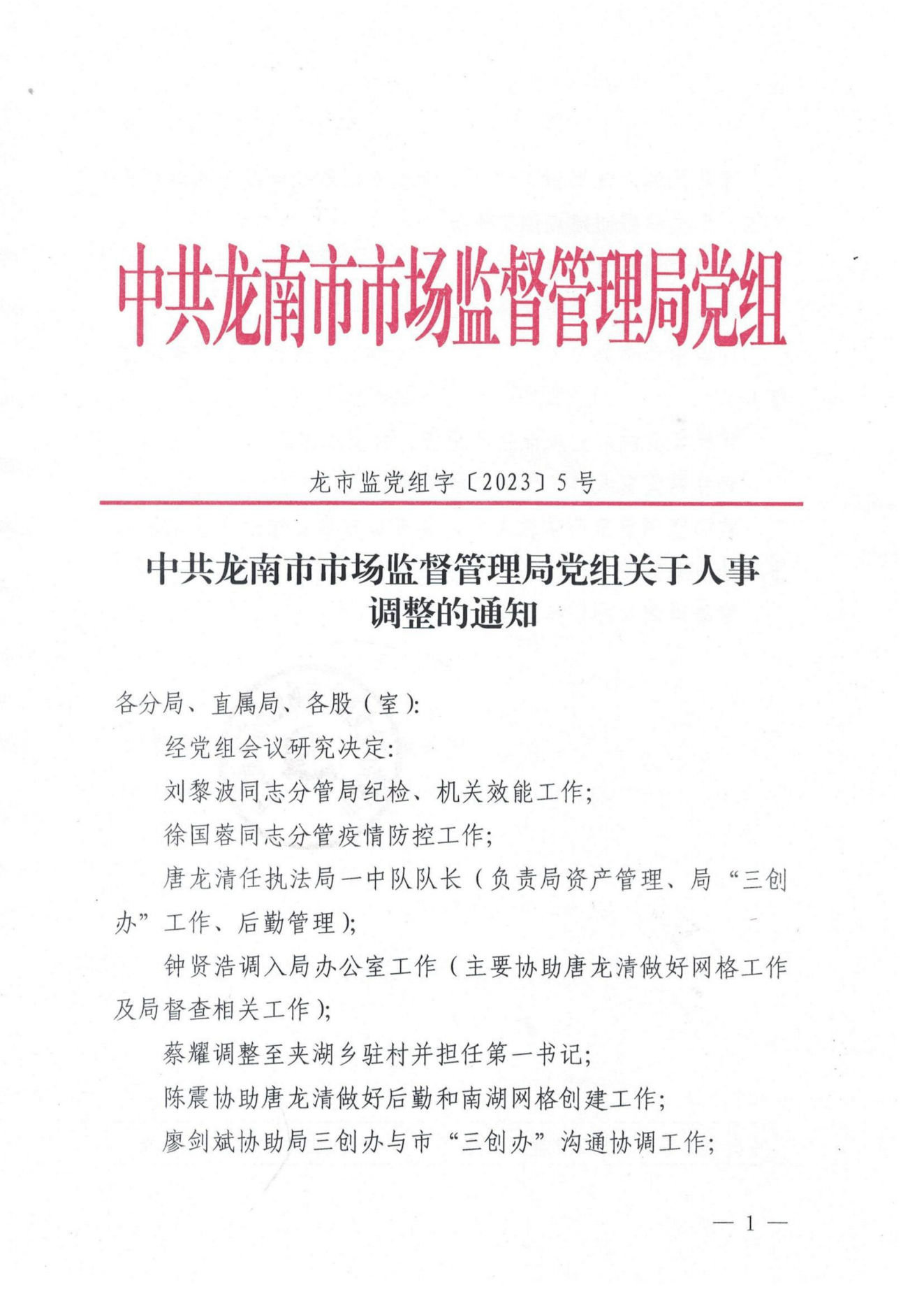 中共龙南市市场监督管理局党组关于人事调整的通知