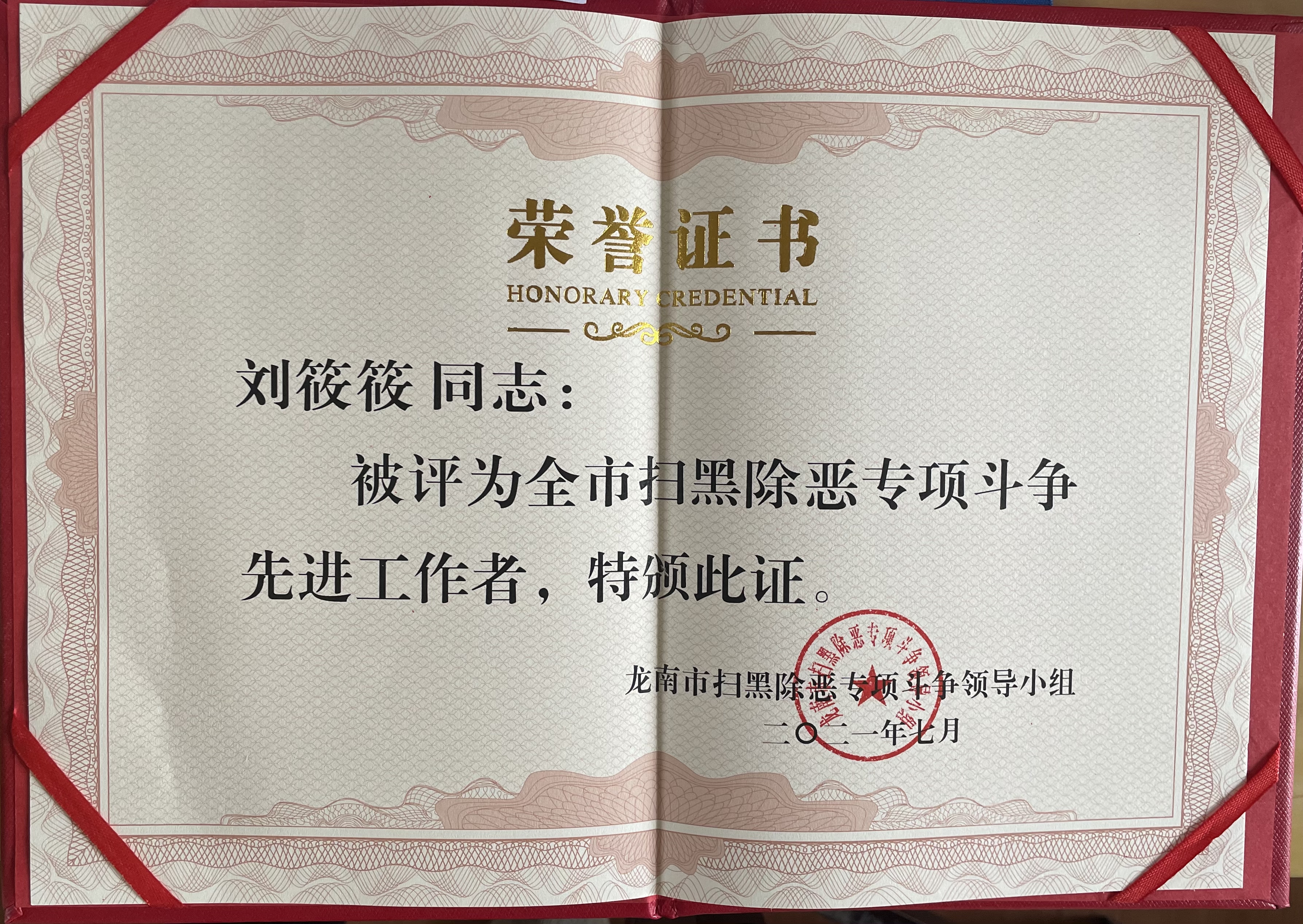 龙南市市场监督管理局荣获全市扫黑除恶专项斗争先进集体,刘筱筱同志荣获先进工作者。