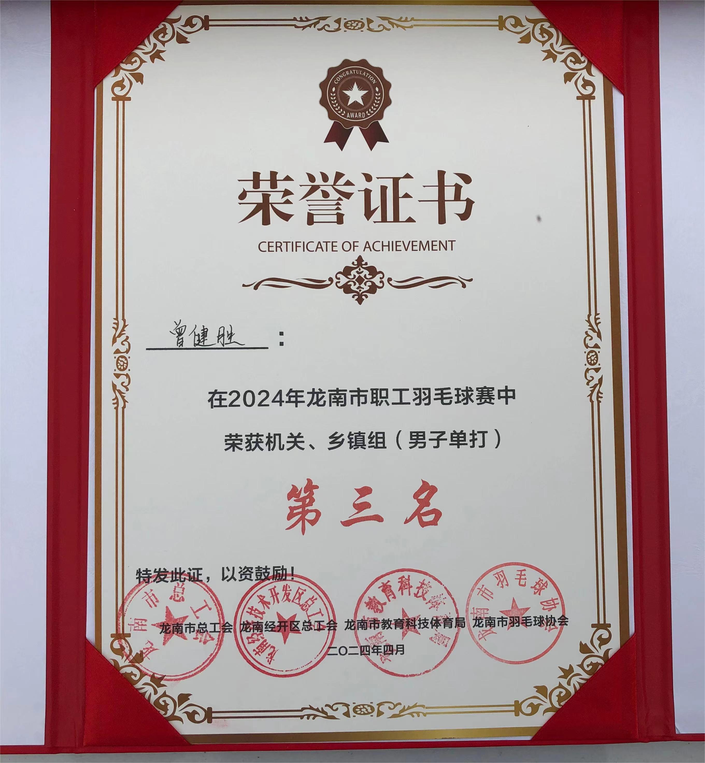 我局曾健胜同志在“2024年龙南市职工羽毛球赛”中荣获机关、乡镇组(男子单打)第三名