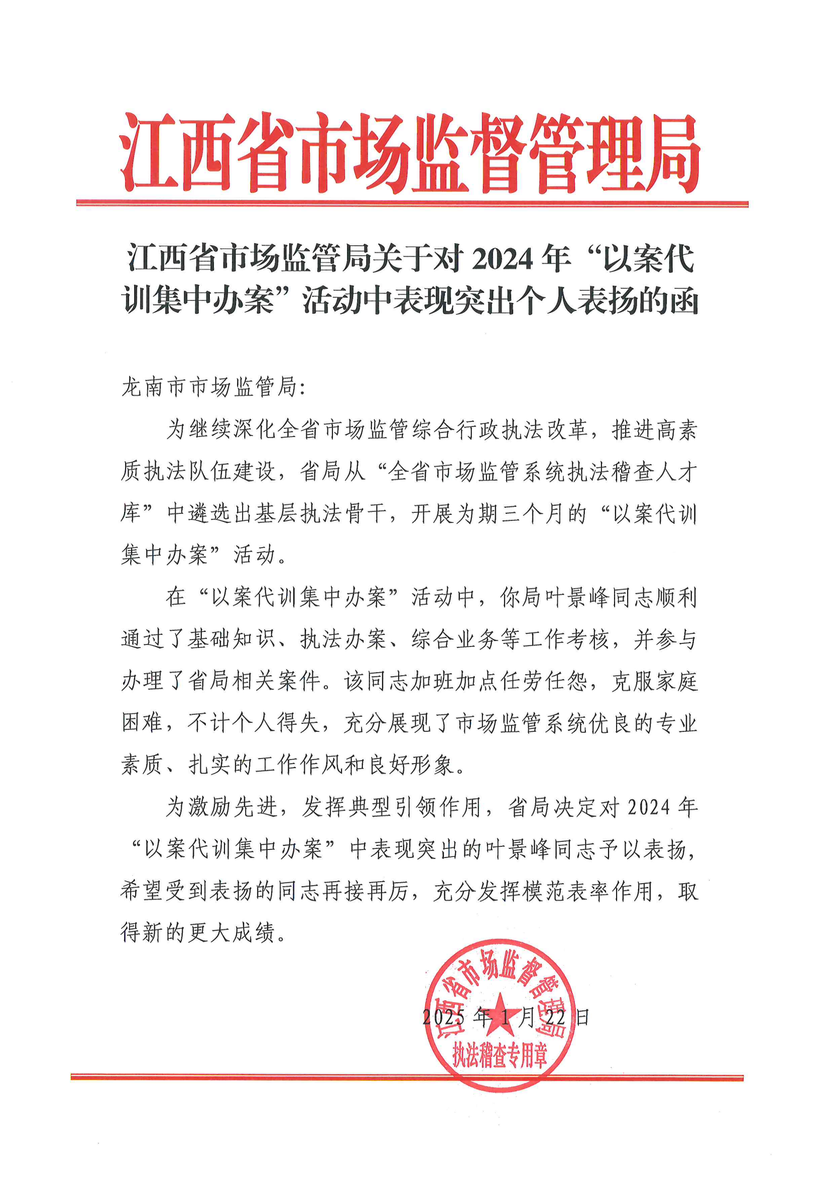 我局叶景峰同志,在江西省市场监管局2024年“以案代训集中办案”活动中表现突出受到表扬
