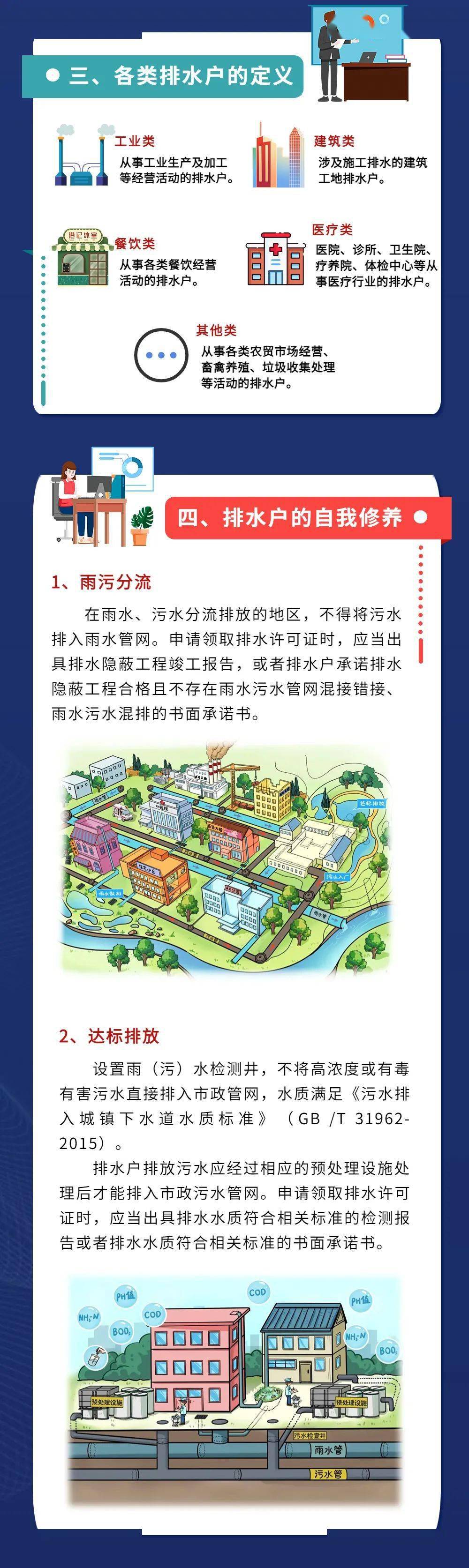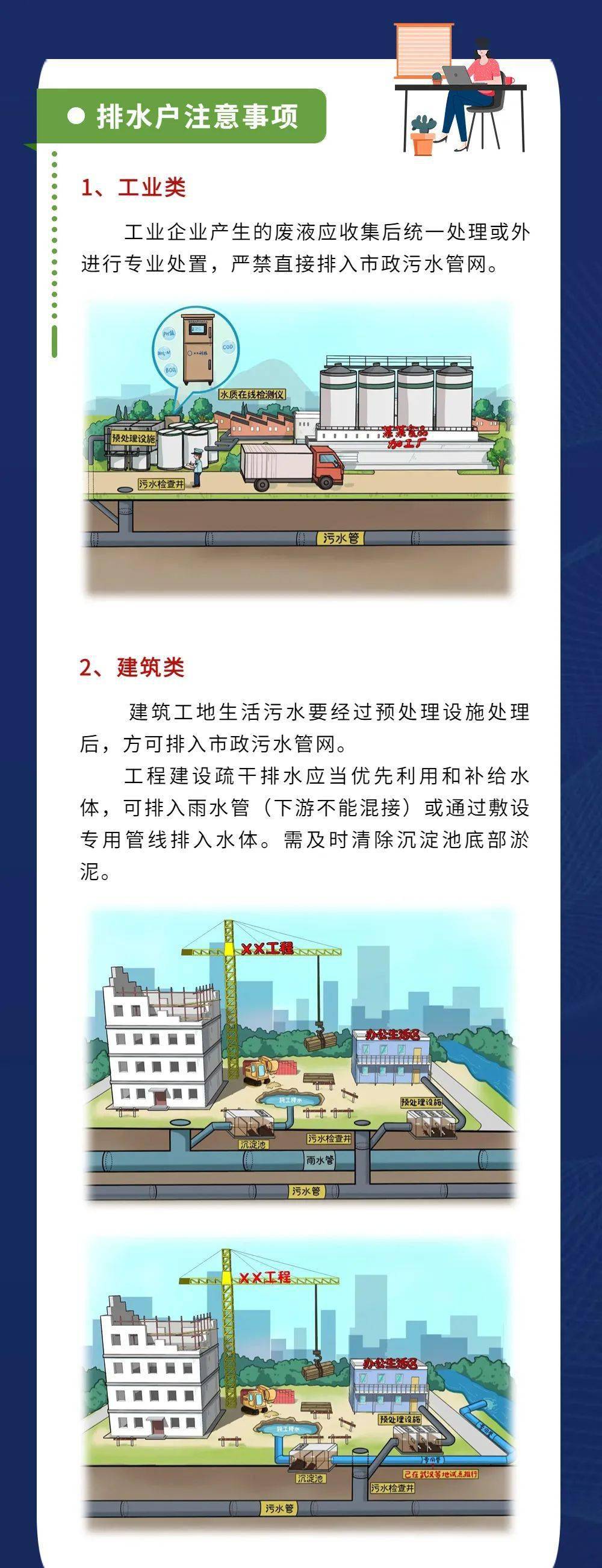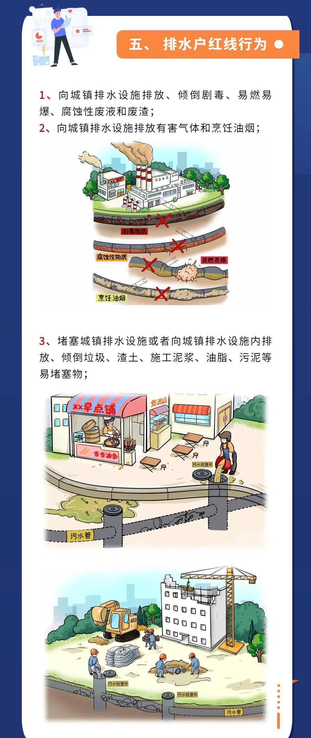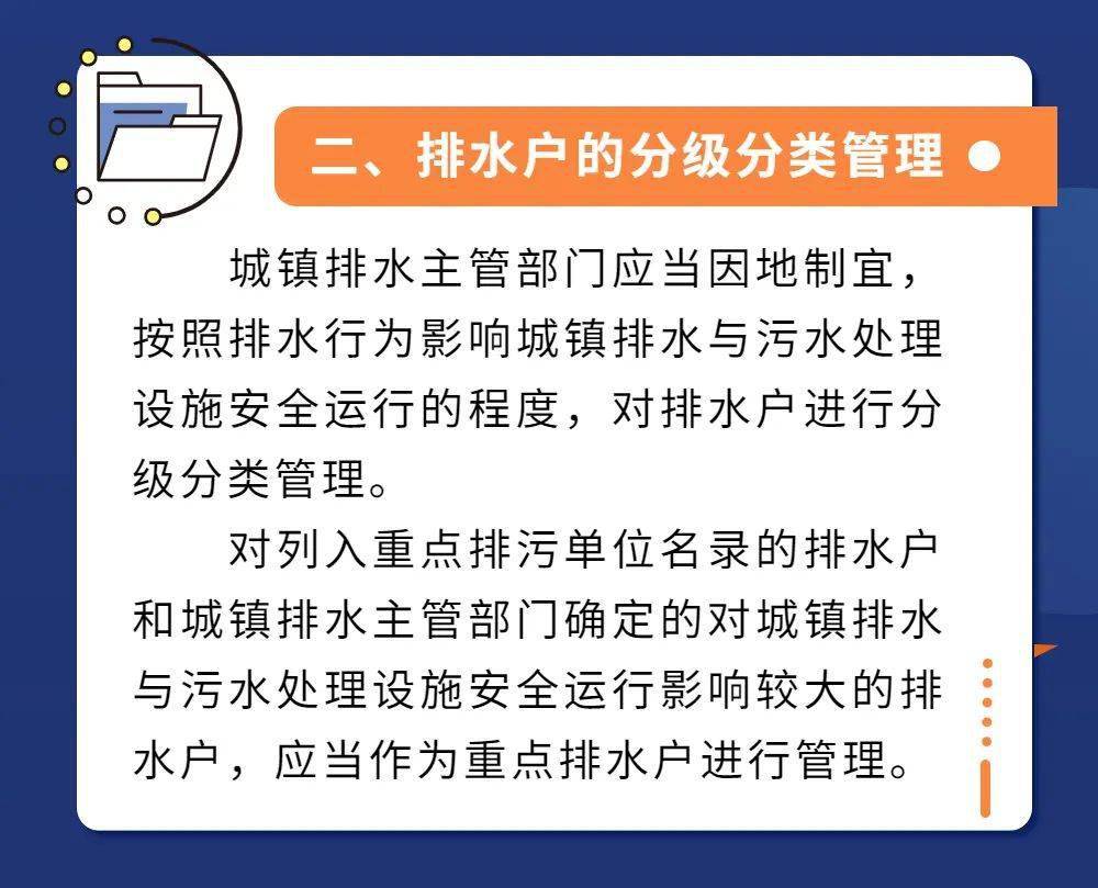 住房和城乡建设部发布关于修改《城镇污水排入排水管网许可管理办法》的决定,自2023年2月1日起施行。办法中明确,城镇排水主管部门应当因地制宜,按照排水行为影响城镇排水与污水处理设施安全运行的程度,对排水户进行分级分类管理。排水户不得向城镇排水设施排放、倾倒剧毒、易燃易爆、腐蚀性废液和废渣;不得向城镇排水设施排放有害气体和烹饪油烟;不得堵塞城镇排水设施或者向城镇排水设施内排放、倾倒垃圾、渣土、施工泥浆、油脂、污泥等易堵塞物;不得擅自拆卸、移动、穿凿和接入城镇排水设施;不得擅自向城镇排水设施加压排放污水;不得有其他危及城镇排水与污水处理设施安全的活动。