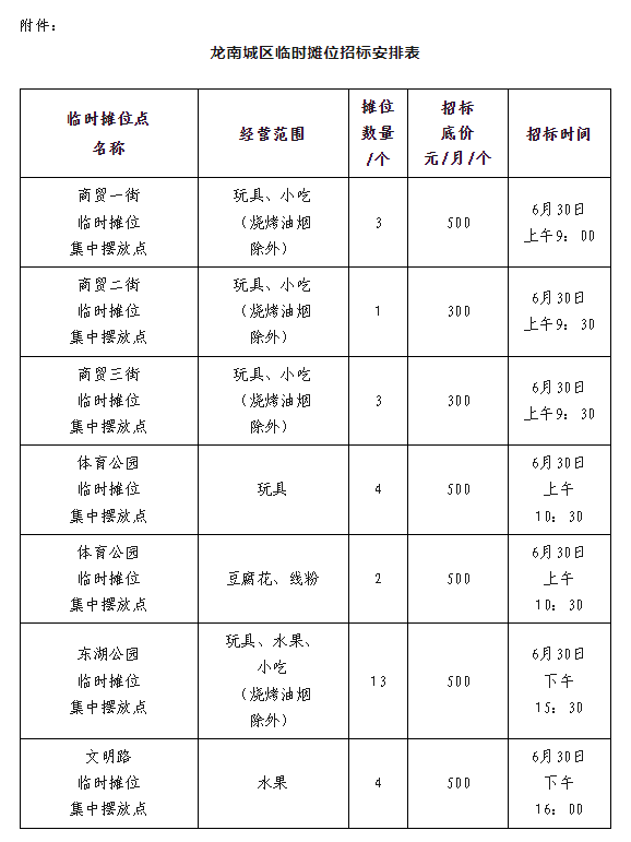 四、招标时间:具体详见《龙南城区临时摊位招标安排表》。