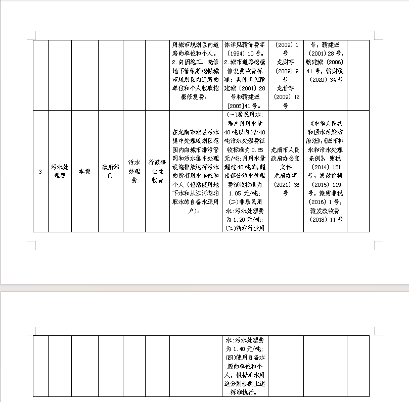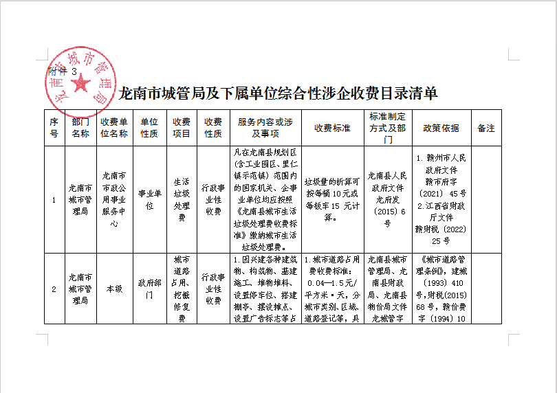 龙南市城管局及下属单位综合性涉企收费目录清单