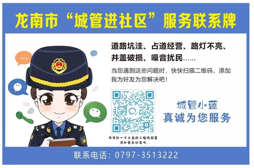 三、报名方式:可直接到龙南市城管执法大队(龙洲综合市场4楼)办公室或直接添加以下二维码“城管小蓝”。现场报名时需携带身份证原件及复印件一份,并填写报名信息;添加“城管小蓝”报名的,发身份证图片和报名信息。