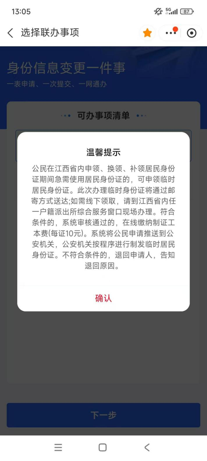 上图选择办理临时身份证时会弹出如下温馨提示。