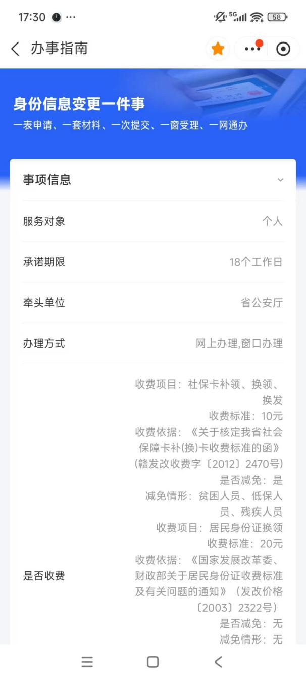 (6)社会保障卡补领、换领、换发。根据公安机关出具的户口登记项目变更更正证明,人力资源社会保障部门为公民换发社会保障卡,公民在线缴纳换发制卡工本费10元。