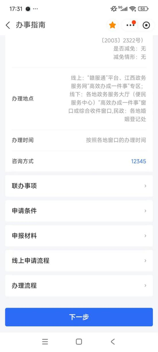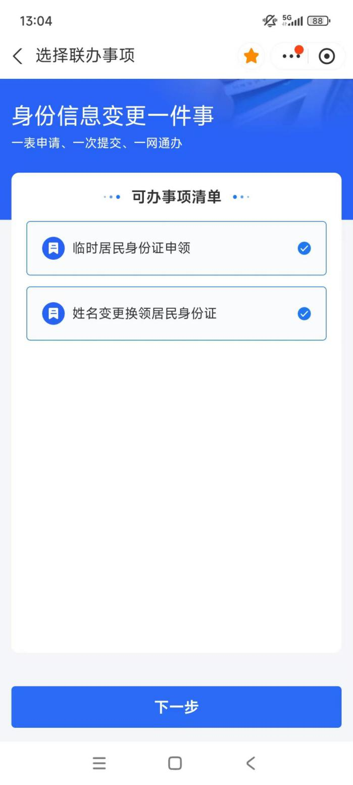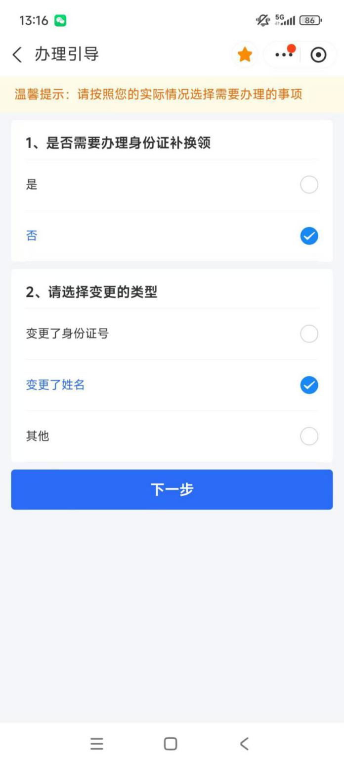 点击身份信息变更一件事,进入办事指南页面点击下一步。