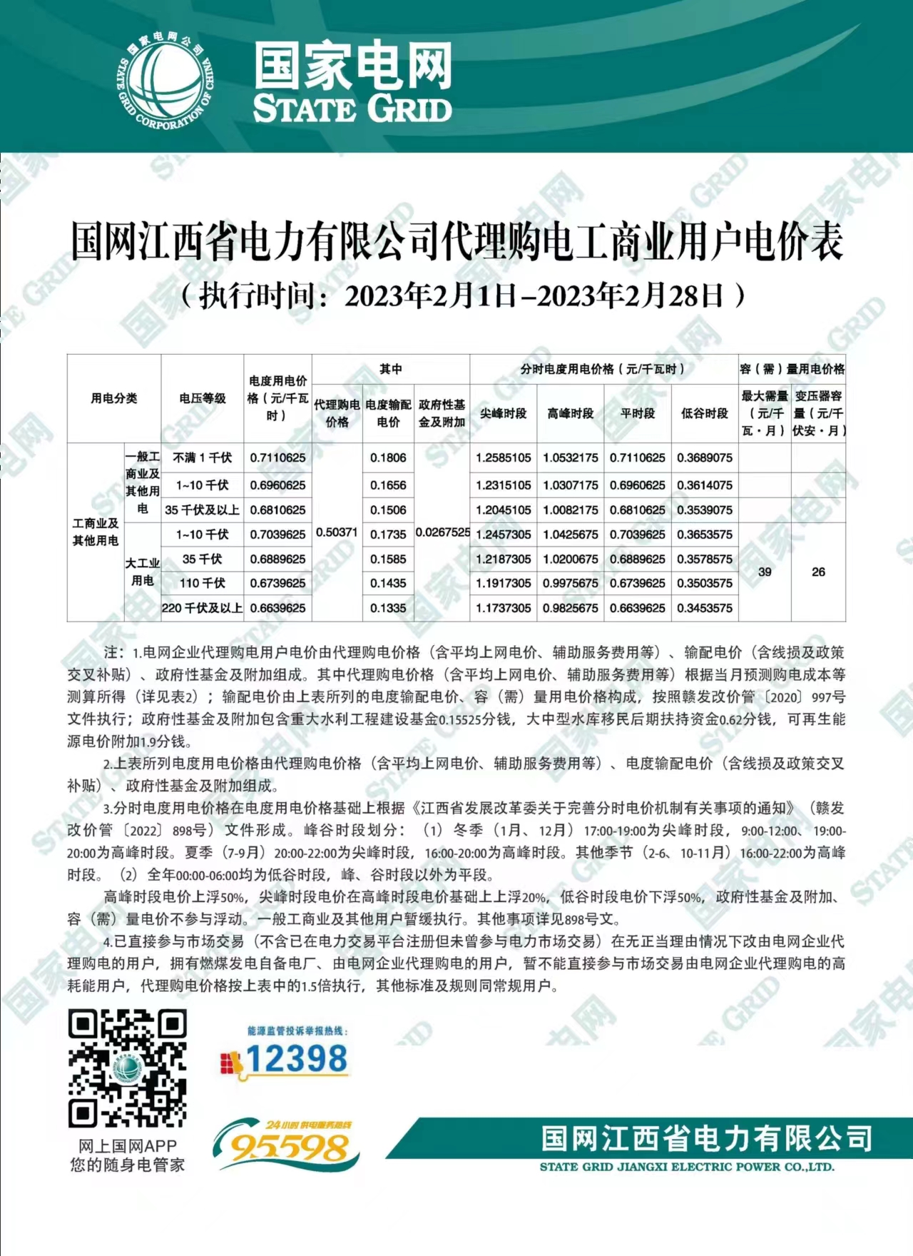 国网江西电力2023年2月代理购电工商业用户电价表