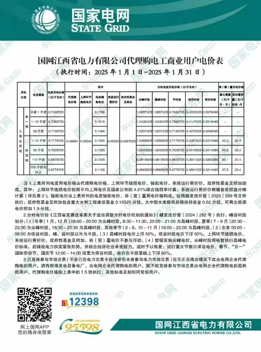 【供电】2025年1月份代理购电工商业用户电价表