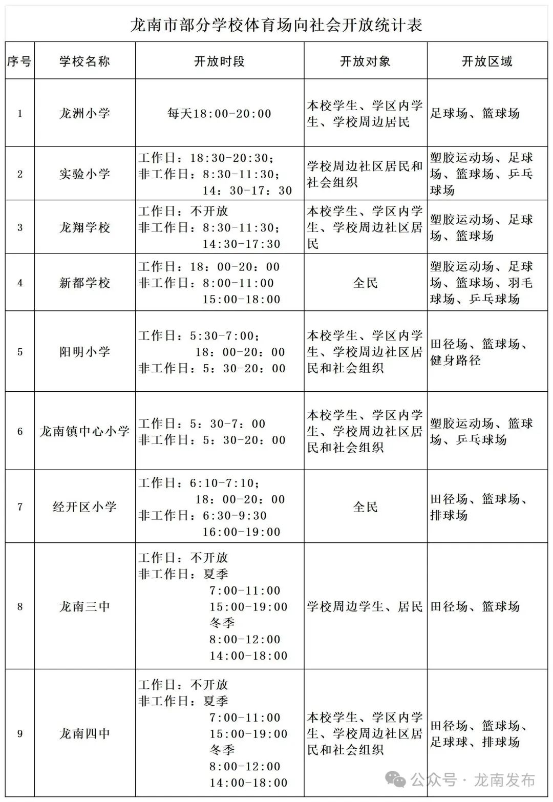 为深入贯彻落实全民健身国家战略,满足人民群众日益增长的体育健身需求,有效提升公共体育场馆使用效率,推动全民健身活动广泛深入开展,经研究决定,自即日起,龙南市部分具备条件的学校体育场馆在保障学校正常教育教学秩序的前提下,将有序向社会公众开放。以下是龙南市部分学校体育场馆向社会开放时间表:
