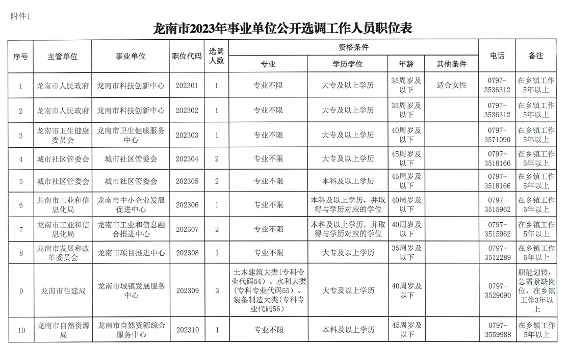 选调对象为龙南市各乡镇(含管委会、林场)事业单位在编在岗的一般干部(不含教师和医务人员)。