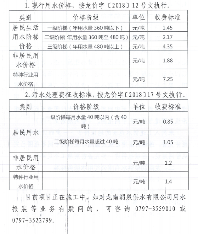 根据8月26日市农村供水安全保障工作调度会议精神,从2025年9月起至2026年6月实施城区周边6个乡镇城乡供水一体化项目建设期间,对乡镇农村居民接入龙南润泉供水有限公司覆盖的供水管网的入户工料费的收费标准形成初步意见,原有已办理开户正在使用的自来水用户(俗称“老用水户”)按800元/户、新入户报装的自来水用户按1500元/户的标准收取入户工料费,项目建设期结束后即2026年7月开始新老用户统一按1500元/户的标准收取入户工料费。水价根据物价部门核定的水价执行,实行“同网、同质、同价、同服务”的原则,如生活用水按1.45元/吨计取,原则上农村用户暂不收取污水处理费(以市政府相关政策文件为准)。