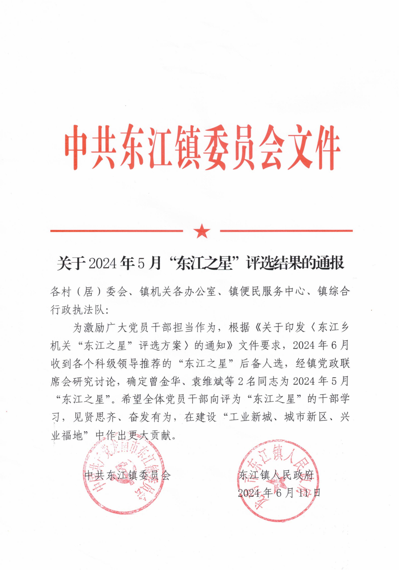 关于2024年5月“东江之星”评选结果的通报