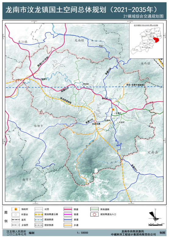 衔接重大交通,融入区域交通网络。衔接上位规划确定的安远至全南市域铁路,预留龙南与南部城镇群之间的铁路通道,强化龙南市与南部城镇群各县间的交通联系,提升龙南作为赣州市副中心城市的辐射作用;落实南龙高速南延,强化对外交通设施。规划落实南龙高速南延建设通道,分流大广高速的交通压力,并在镇域范围内新增1处汶龙高速出入口,加强对外交通可达性; G105改建工程、X853提升工程,优化区域干线公路网络,提升区域交通服务水平和能力。