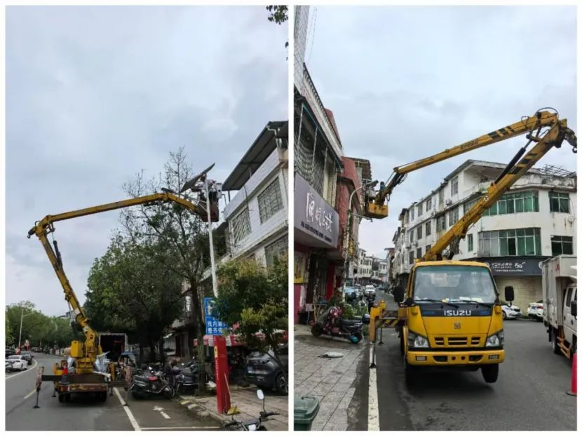 随后,市城管局、市公共事业服务中心与汶龙镇政府第一时间联动响应,组建路灯排查维修工作小组。工作小组沿主次街道、背街小巷逐一排查,精准记录路灯损坏位置、缺失点位及现有照明覆盖情况,在全面掌握实际需求的基础上,科学制定路灯增补与更换方案,明确安装点位、数量及施工进度表,并通过加班加点作业,于2025年学生中考前完成全部施工任务,共新增35盏路灯、维修80盏路灯。