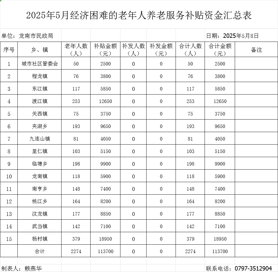 2025年5月经济困难的老年人养老服务补贴资金汇总表