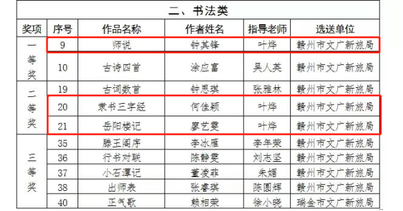 9月26日,由中共江西省委宣传部、江西省文化和旅游厅联合印发了《关于公布第八届江西艺术节·江西省第十三届少儿艺术节获奖名单的通知》,在各县(市、区)的大支持下,赣州市选送的文艺作品在此次艺术节上喜获佳绩,其中,龙南市选送的三幅书法作品荣获一个一等奖、两个二等奖。此次少儿艺术节优异成绩的取得,充分展示了我市少儿文艺创作的丰硕成果,展现了新时代龙南群众文化事业昂扬向上发展的精神风貌。