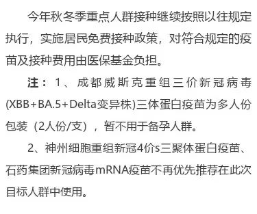 根据国务院联防联控机制科研攻关组疫苗研发专班论证意见,经国家卫生健康委建议,国家药监局组织论证同意,成都威斯克重组三价新冠病毒(XBB+BA.5+Delta变异株)三聚体蛋白疫苗现已在一定范围内纳入紧急使用,可用于近期重点人群接种。