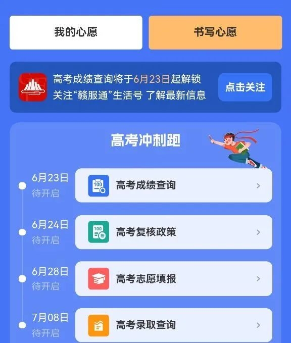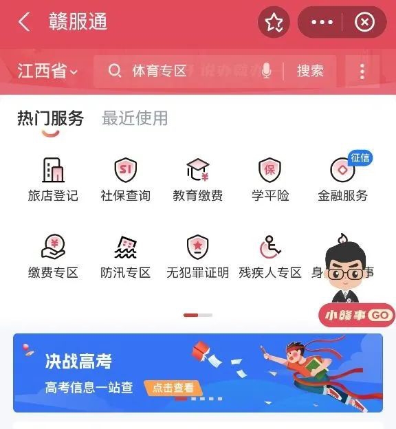 “赣服通”上线高考服务专区,汇集高考成绩查询、高考复核政策、高考录取查询等各类贴心服务。