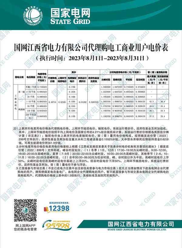 国网江西电力关于2023年8月代理工商业用户购电价格的公告