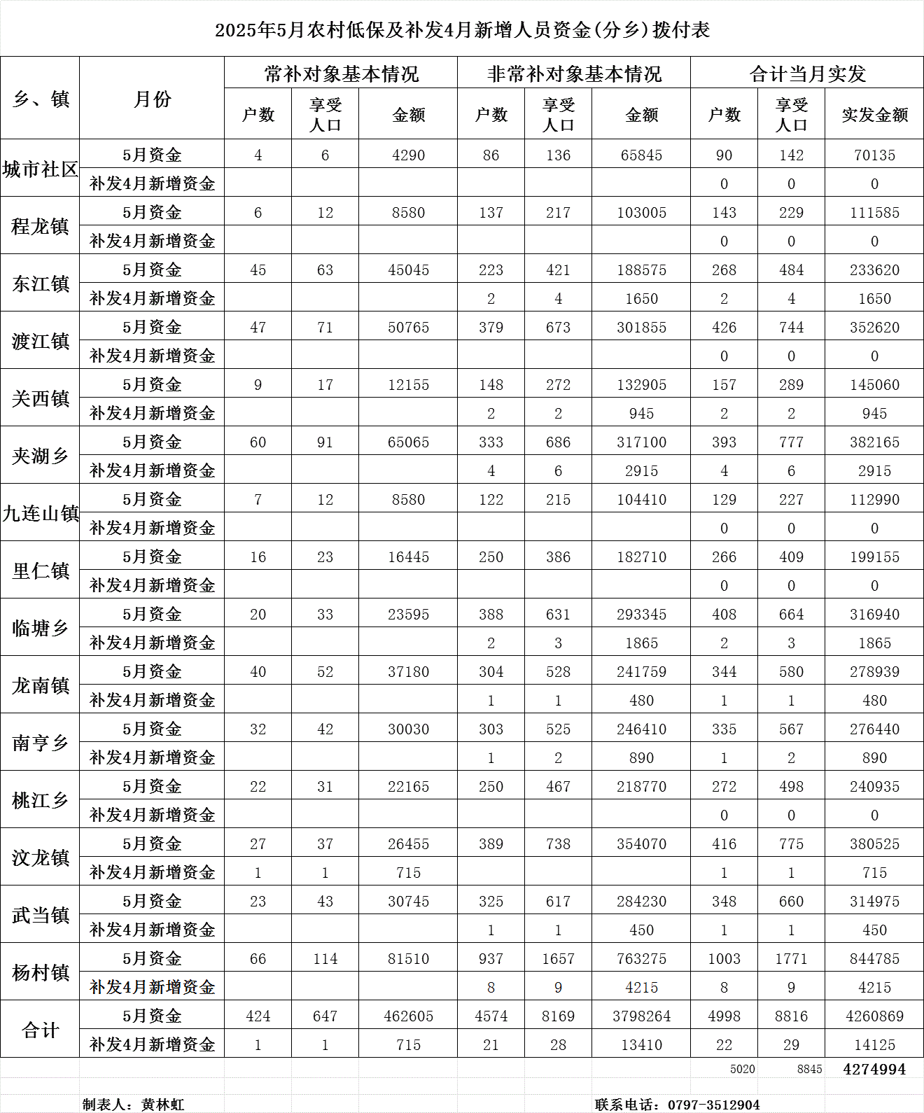 2025年5月农村低保及补发4月新增人员资金(分乡)拨付表