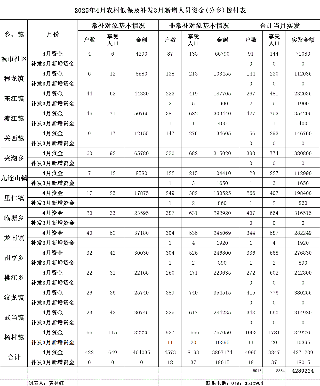 2025年4月农村低保及补发3月新增人员资金(分乡)拨付表