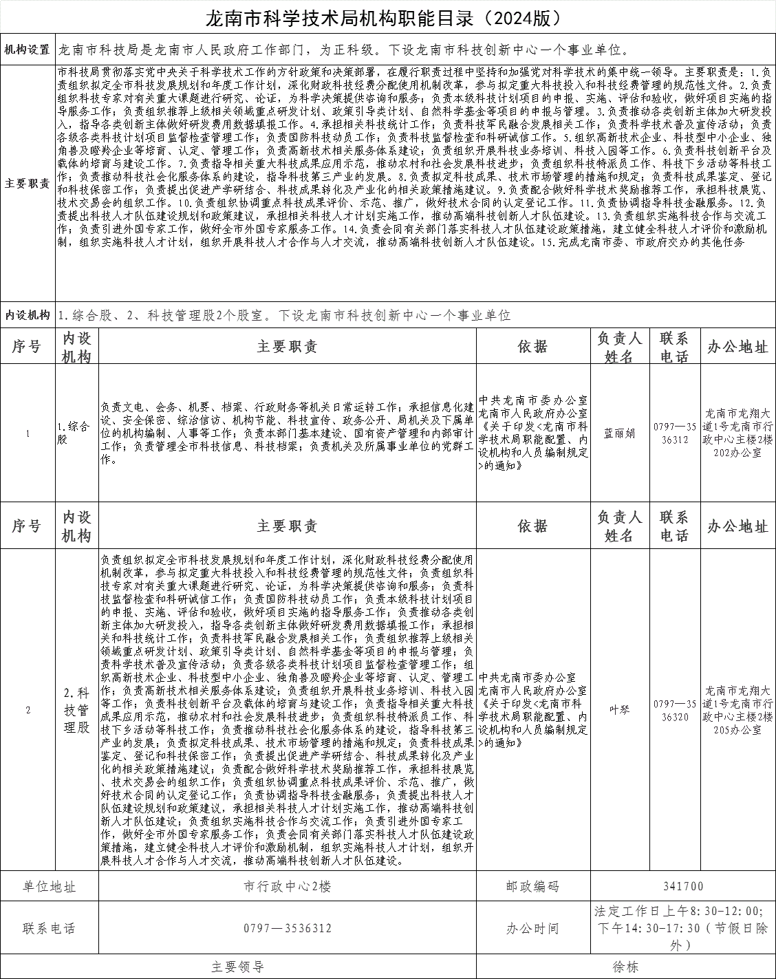 龙南市科学技术局机构职能目录(2024版)